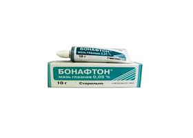 Препарат с противовирусным действием, активен в отношении некоторых типов аденовирусов и Herpes simplex. Механизм действия базируется на подавлении процесса синтеза цитоплазматических белков. Бонафтон уменьшает симптоматику инфекционного процесса глазного яблока и конъюнктивы свода, гиперемию, ускоряет эпителизацию язв и нормализует структуру роговицы.