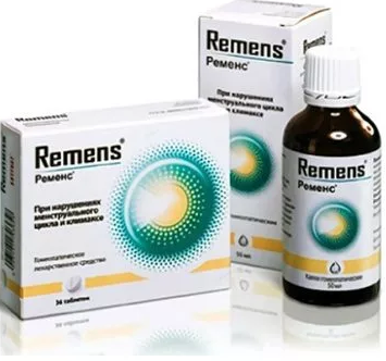 В состав Ременса (гомеопатические капли) входят: 10 мл экстракта канадской сангвинарии, 5 мл экстракта кистевидной цимицифуги, 10 мл экстракта пилокарпуса, 10 мл секрета железы каракатицы, 10 мл змеиного яда сурукуку.
